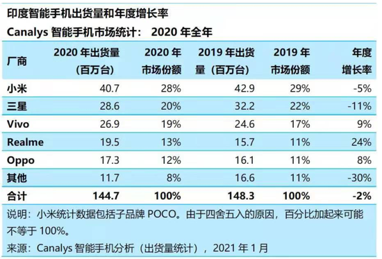 数据表示,2020年以出货量酌量,小米在印度智妙手机市集份额为28%,第一季度以致一度超30%。同期,中国厂商对印度智妙手机市集总出货量的孝敬达到77%,同比增多5%,且很可能会接续增长。