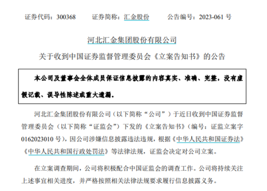 7月28日晚间,汇金股份发布公告称,公司于近日收到中国证监会下发的《立案奉告书》,因公司涉嫌信息表露犯罪非法,左证《中华东谈主民共和国证券法》《中华东谈主民共和国行政处罚法》等法律法则,证监会决定对公司立案。