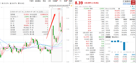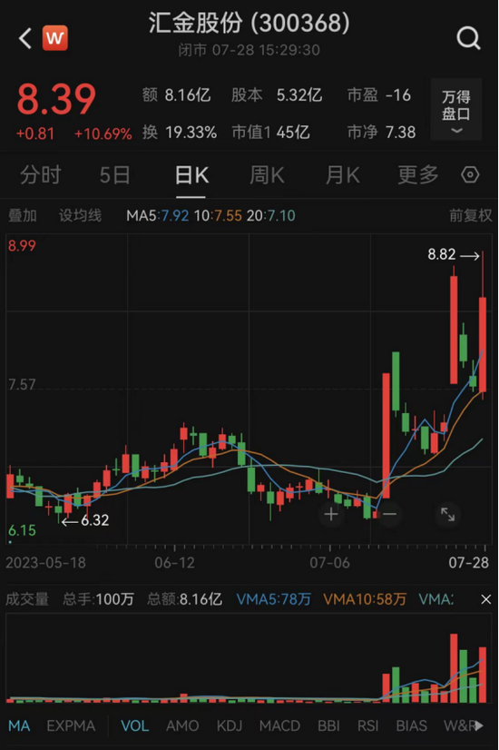 收尾7月28日收盘,汇金股份每股报8.39元,涨幅10.69%,最新市值45亿元。