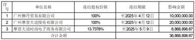 公司收到广州市黄埔区东说念主民法院(以下简称“黄埔法院”)出具的(2022)粤0112民初10104号《民事裁定书》,肯求东说念主东莞永恒创业投资行(有限合资)向黄埔法院肯求财产保全,黄埔法院裁定冻结被肯求东说念主摩登大路前锋集团股份有限公司、林永飞、翁武强、刘文焱名下的银行进款36,868,898.67元大要查封、扣押其相应价值的财产。根据上述裁定,黄埔法院出具(2022)粤0112执保813号《财产保全见告书》,对公司抓有的部分股权财产聘请保全措施,具体情况如下: